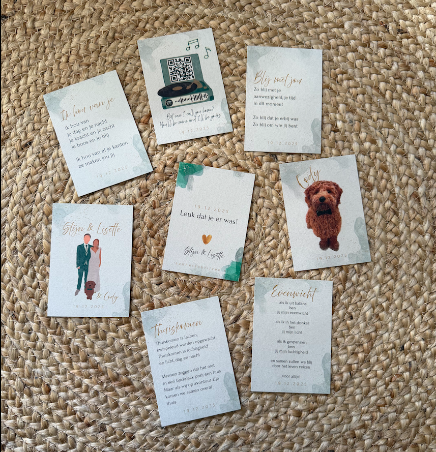 Ik maak ook graag een paar setjes van alle kaartjes,  bijvoorbeeld voor jullie zelf om aan jullie ouders of getuigen te geven.