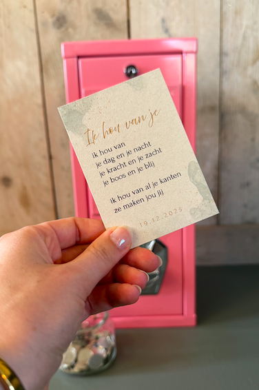 Wij hadden de Vending Machine van Fleur op onze bruiloft en het was echt een enorme hit! Iedereen stond in de rij om een kaartje te trekken en was verrast door de gedichten en tekeningen. Een superpersoonlijk bedankje en een blijvend aandenken. We horen nog steeds dat ze op koelkasten hangen š